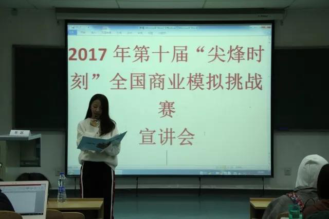 宣讲会在一段由经济传媒精心制作的、极具纪念意义的、以回顾往届“尖烽时刻”全国商业模拟大赛为主题的视频中拉开序幕,下午16:00,主持人宣布本次宣讲会正式开始。