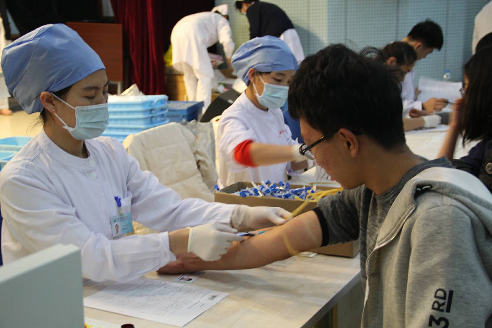 7点半,学院志愿者准时到达大学生活动中心,开始准备工作。活动现场共分为登记区、检验区、献血区、休息区、领证区五大区域。在领证区,完成献血的同学们可以来此领取献血证,除此之外,学院还特别准备了“爱心大礼包”,里面有牛奶、大枣、面包等营养补给品。